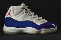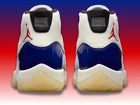 The Air Jordan 11 Retro Rare Air (2025) returns with subtle swagger and bold heritage. Dressed in deep royal blue, fire red, sail, black and muslin, the standout feature is the high-shine patent leather mudguard in the royal blue hue, a signal that this isn’t just another run of the AJ11. Classic white leather above gives it that clean contrast while fire red hits and a muslin-tinted translucent outsole add vintage flavor. · Lore plays a major role here: part of the "Rare Air" series that nods to sample-model aesthetics and collector culture, this drop adds "JORDAN" spelled across the eyestays