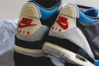 The Jordan 3 Retro OG Rare Air brings a fresh twist to a classic silhouette. Its black leather upper is complemented by grey suede overlays, replacing the traditional elephant print, and features mismatched Nike Air heel tabs, one reversed for a unique aesthetic. Accents of chile red, military blue, and coconut milk add vibrant pops of color, while the red Jumpman logo on the tongue ties the design together. · This release pays homage to early Jordan samples, embracing imperfections as marks of rarity. The combination of premium materials and unconventional details makes this sneaker a standou