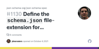 Answer from Eric Hartford on Stack OverflowI personally use .schema.json, but there is no official file extension. The official mime type however is "application/schema+json".
