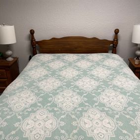 This cotton bedspread was originally introduced in the 1950s as a classic matelasse but was later transitioned into production as a flat jacquard quilt called "Brittany" in the 1970s. Flat jacquards, lacking the signature “puff” of a matelasse bedspread, did not take off in popularity and so the pattern was discontinued.