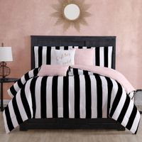 Bring effortless luxury into your bedroom with the Juicy Couture Cabana Stripe Reversible bedding set. This set features bold stripes with a distressed reversible print on super-soft fabric that makes this as comfortable as it is stylish. The bedding set comes with three fun decorative pillows that feature gold embroidery and pleats.