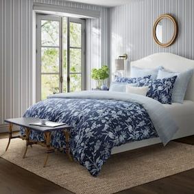 Give your bedroom a soothing, atmospheric look that will have you excited to go to sleep each night. The Navy Farmhouse Dreams King 3-pc. Comforter Set is the perfect choice for any stylish bedroom. Set includes one (1) comforter and two (2) shams Comforter measures 104W x 92L in. Shams measure 17L x 12.5H in. Crafted of microfiber polyester Striped pattern Hues of white and blue Reversible solid navy design Hypoallergenic material Care: Machine wash cold. Tumble dry low. Do not bleach, iron, or use softener. This item is available at Kirklands.com only, not available in stores. Please note: t