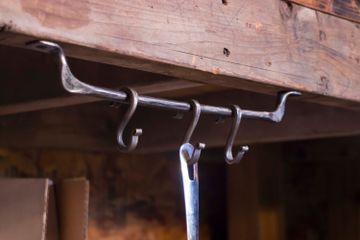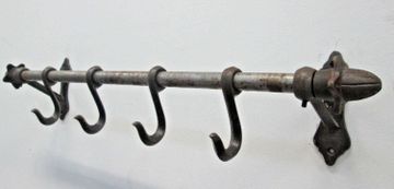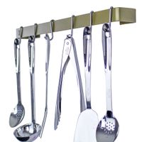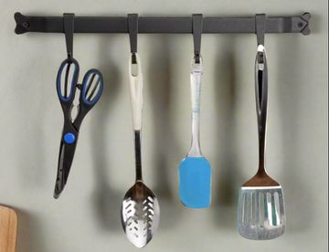 Stainless Steel with Sliding Hooks · A bowed band of stainless steel with an assortment of sliding hooks, this style of utensil rack is easy to mount and easy to hang an assortment of utensils. The hooks allow for arranging the items in any order or number (within reason) desired. The only drawback to this style of utensil rack is that it doesn’t allow for utensils that do not come with a hole in the handle. · Wrought Iron Basket with Hooks and Towel Rack · Combining beauty and utilitarianism, a rack like this is perfect for hanging just about anything from potholders and towels to cutting boa