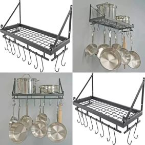 Optimize your kitchen space with this versatile pot holder, designed for flexible wall installation. Its strong, hand-welded metal frame supports heavy cookware up to 44 lbs, including large skillets. The rust-resistant finish ensures longevity even in humid environments. Offering two mounting options, it adapts seamlessly to your kitchen layout. The sleek metal design not only provides practical storage but also adds a modern industrial touch. This rack keeps pots and utensils within easy reach, streamlining kitchen workflow and making the most of limited areas.