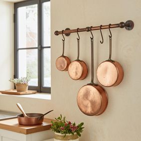 Organize your pots and pans while conserving space with a wall-mounted pot rack, which may have hooks for as many as 20 pots, pans, and utensils.