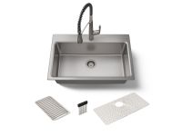 K-78960-1PC single-bowl kitchen sink kit comes with faucet, multipurpose grated rack, and custom-designed knife holder to improve everyday kitchen tasks.