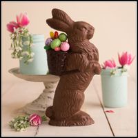 Our extra large handmade chocolate bunnies are decorated with dark chocolate foiled eggs and can be ordered in rich dark, creamy milk or silky white chocolate. The semi-solid bunnies are 17 1/2" and approx. 4 lb. One per order.
