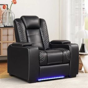 The accent lights are way too bright and ruin the entire light controlled room. The leather makes a lot of noise when it rubs on other leather. The leather is supple but it starts coming apart at the seams quickly if you have children. The spinning accessory tables are tiny and cumbersome. The ajustable headrest barely makes a difference.