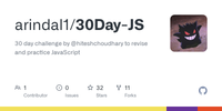 GitHub - arindal1/30Day-JS: 30 day challenge by @hiteshchoudhary to revise and practice JavaScript · GitHub