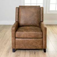 Relax in style with this Full-Grain Leather Recliner Accent Chair. It’s super comfortable reclining design is ideal for sitting back and unwinding after a long day. You’ll love its smooth finish and nailhead detailing. Chair measures 28.75L x 27W x 42H in.; seat measures 20H in. Crafted with a wood frame Brown leg finish Upholstered with brown top-grain leather front with high density foam fill Sides and back feature matching vegan faux leather Features push back recliner design Accented with nailhead trim Weight capacity: 220 lbs. Assembly required Not intended for commercial use Care: Dust w