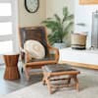 A sturdy and long lasting construction that for a years of enjoyment. Give your home a welcoming and sophisticated look with this accent chair and ottoman set. Display this mahogany armed side chair and ottoman with a round wooden table next to your bookcase for the perfect reading moment. This item ships in 1-carton. Cozy leather padding on both chair and ottoman. Suitable for indoor use only. This item ships fully assembled in 1-piece. Maximum weight limit is 200 lbs. Made in Indonesia. Can accommodate 1 person. This is a single dark brown colored chair and stool set. Traditional style.