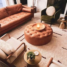An ottoman is a versatile piece of furniture that can be used in your living room in various ways. Rather than taking up tons of floor space with multiple pieces, why not combine your coffee table and ottoman into one multi-functional centerpiece? · A leather tufted ottoman coffee table can make a fashionable, eye-catching addition to your living room, providing you with a space to rest your legs or put your book down, all in one. Streamline your living room design by eliminating excess furniture pieces for a contemporary sense of minimalism, combined with a hint of tradition. · A leather tuft