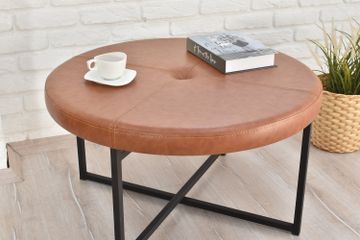 One that you may find available is the Fleet round leather coffee table. This piece measures 24 inches in diameter to fit small spaces, and it has a sleek brass-finish frame for modern style. The frame is poplar and plywood for durability, while the top is upholstered in premium aniline-dyed ...