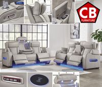 FINEZA Light Gray 100% Leather Power Reclining Sofa & Loveseat - CB Furniture