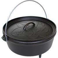 The Lodge Boy Scout Engraved camp oven has a distinctive Boy Scout fleur-de-lis logo on the lid. The Lodge camp oven includes 6 quart seasoned, ready to use camp oven with custom engraved iron cover.