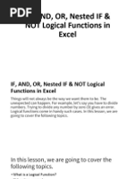LOGICAL FUNCTIONS - Free download as PDF File (.pdf), Text File (.txt) or read online for free. The document discusses logical functions in Excel including the IF, AND, OR, and nested IF functions. It provides examples of how to use each function, such as using IF to check if a value is greater than 6000 and returning 'Yes' or 'No'.