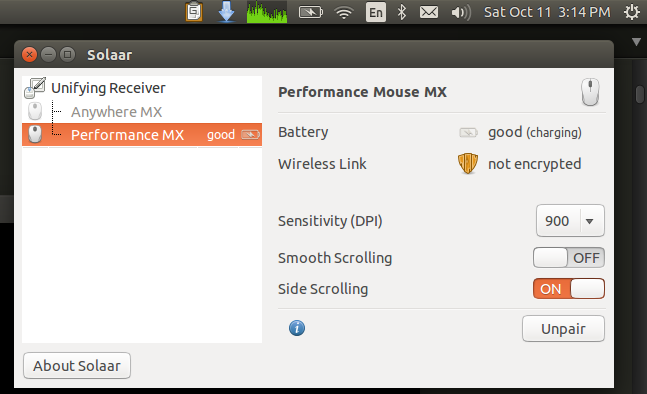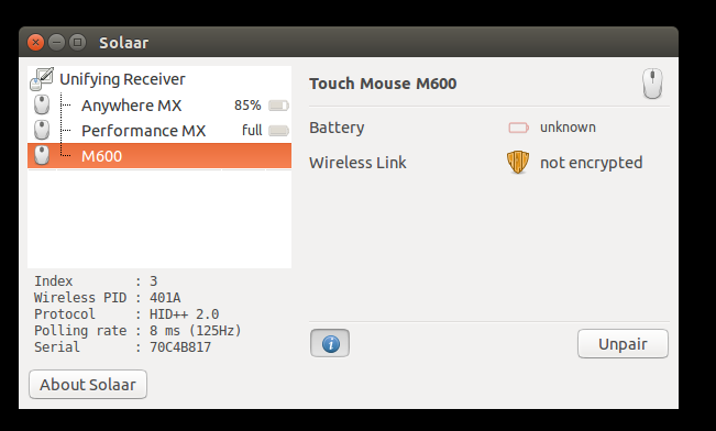 So the Unifying receiver is not only supported by it offers (Depending on the device) several features like the image above. This image was with Ubuntu 12.10