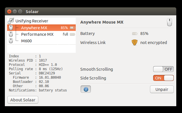 Solaar offers an easier way to know how much battery you have left, how much time you have let, which mouse you are using and more. It also offers special features like detecting if the battery is charging:
