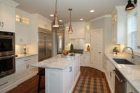 Create more usable storage within the existing kitchen footprint. Design a better transition between the upper cabinets on the 8-foot sink wall and the adjoining 9-foot cooktop wall. Make room for more counter space around the cooktop. It was poorly lit, cluttered with small appliances and confined by the tall oven cabinet. Solutions: A large island, that seats 5 comfortably, replaced the small island and kitchen table.
