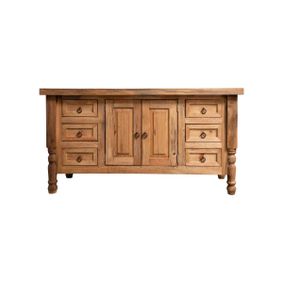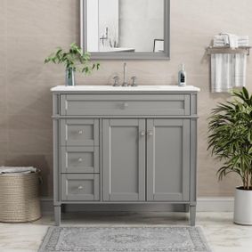 It's topped with a ceramic countertop and accented with a hand-painted finish. Plus, it offers under-sink storage for a few cleaning supplies or extra rolls of toilet paper. Best of all, it comes with an under-mount sink and a pre-drilled hole for a faucet of your choice (sold separately). Vanity fits perfectly in my narrow bathroom.
