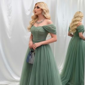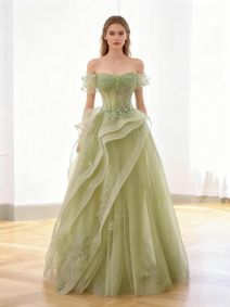 A glamorous green glitter formal dress with sheer sleeves, sweetheart neckline, and a high front slit. ... A sage mermaid silhouette dress with a glittery finish, lace-up back, and floor-length hem. Windsor Deyna Formal Mesh Off-The-Shoulder Long Dress in Sage