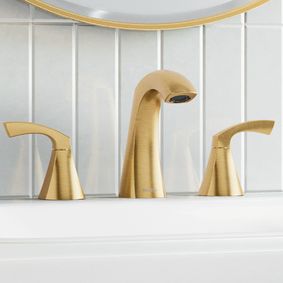 Shop the full Lindor collection from faucets to towel rings to give your bath full coordinated and stylish appeal. Faucet handles can be installed at any distance between 8 in to 16 in for a more customized widespread installation.View More ... allen + roth Harlow Brushed Gold Widespread 2-handle WaterSense Mid-arc Residential Handle Bathroom Sink Faucet with Drain