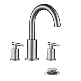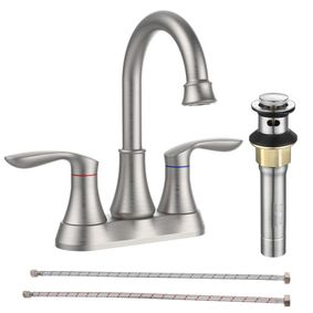 Delta WaterSense labeled faucets, showers and toilets use at least 20% less water than the industry standard—saving you money without compromising performance.View More · Project Source Dover Brushed Nickel 4-in centerset 2-handle WaterSense Mid-arc Residential Handle Bathroom Sink Faucet with Drain with Deck Plate