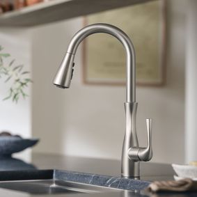 From finishes that are guaranteed to last a lifetime, to faucets that perfectly balance your water pressure, Moen sets the standard for exceptional beauty and reliable, innovative design. Exceptional form and uncomplicated style features give the Adler collection an ageless yet fashion-forward presence. Tailored yet relaxed, the Adler collection is an exercise in design balance. This lustrous collection works seamlessly with today's lifestyles.View More ... Project Source Tucker Stainless steel Single Handle Deck-mount Pull-down Kitchen Faucet with Sprayer (Includes Deck Plate)