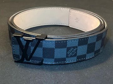 Elevate your style with this striking men's black checkered Louis Vuitton belt, a statement piece that combines luxury with a modern edge. As you can see, it is brand new and in the box! Key ...View more ... Used with some minor rips. Looks great on the outsideView more ... Selling Louis Vuitton Damier Azur belt with gold LV initials buckle.
