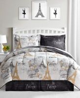 Ooh-la-la! The enchanting city of Paris is the focal point of this reversible 8-pc. comforter set from Fairfield. Picturesque Eiffel Towers, local postmarks and quintessential French words like "je t'aime" and "bonjour" decorate one side in white, gold and black hues. The flip side features contrasting black and white hues for when you feel like mixing it up. Each set includes a cozy comforter, pillow sham, bedskirt, standard pillowcase, a flat sheet and a fitted sheet for a complete matching ensemble.