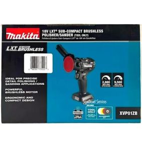The 18V LXT® Sub-Compact Brushless Polisher/Sander (XVP01ZB, tool only) is a compact solution for precise detail polishing or sanding applications. A dual speed selector provides 0-2,800 RPM in polish mode and 0-9,500 RPM in sanding mode. A variable speed trigger with power lock-on provides added convenience. The brushless motor enables the motor to run cooler and more efficiently for longer run time performance and rubberized gear housing helps protect delicate surfaces. The polisher/sander features Anti-restart protec