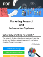 The document discusses marketing research and information systems. It defines marketing research as the systematic design, collection, analysis and reporting of relevant data to address a specific marketing situation.
