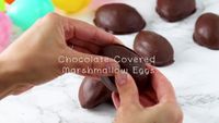 Remove marshmallow eggs from flour, and dust off any excess flour. Dip into melted dark chocolate candy coating. Place flat side down on wax paper. Let stand until set. Pour white candy coating into a heavy-duty resealable plastic bag. Cut a small hole in the bottom corner. Drizzle over eggs. ... Got a question? Share it with the community! ... Sign up for our newsletter to get recipes, easy dinner ideas, tasty treats and more delivered straight to your inbox.