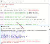 February 21, 2009 - import math # This will import math module # Create two numeric objects x and y x = 45.17 y = -36.89 # Calculate and display the ceil value of x res = math.ceil(x) print("The ceil value of x:", res) # Calculate and display the ceil value of ...