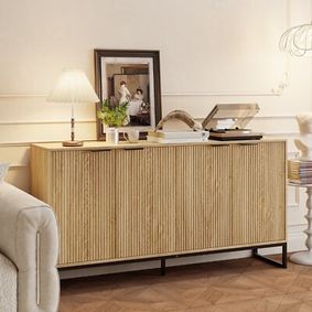 Sabina sideboard featuring ash wood fluting decorative door panel design to enhance the overall dimension and rhythm. With a spacious interior and multiple independent storage compartments, the credenza is ideal for storing tableware, glasses, tablecloths, and various items.