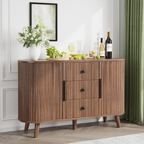 The 3-Drawer Brown Sideboard Cabinet, that boasts of its mid-century design with a sophisticated touch. It features a rich brown finish and has three spacious drawers that offer ample storage space for your dining room & kitchen essentials. The clean lines, intriguing wood veneer, and oversized drawer and door hardware contribute to the stylish appeal of this piece.