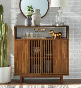 Your space, your style, your rules – with the Mid-Century Modern 2-Door Sideboard, the options are endless. Whether you style it as a dining room buffet table, a coffee bar, or an entryway organizer, this narrow sideboard cabinet makes a statement without trying too hard. Built from knot-free solid pine wood with engineered wood back panels, this wooden sideboard is as sturdy as it is versatile. Plus, its clean, low-VOC finish makes it a thoughtful, healthy choice for your space. Two slatted doors hide adjustable shelves with three height options, so whether you’re stashing serving platters, m