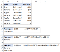 Find the average of a group of numbers by clicking the AutoSum button to use the Average function, or use the Average and the AverageIF functions in formula to find the average of a group of numbers.