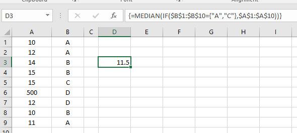 =MEDIAN(IF($B$1:$B$10={"A","C"},$A$1:$A$10))