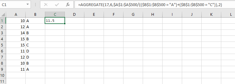 =AGGREGATE(17,6,$A$1:$A$500/(($B$1:$B$500 = "A")+($B$1:$B$500 = "C")),2)