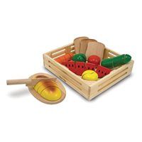 Melissa & Doug Toy Cutting Food Set is perfect for young chefs looking to explore a little mealtime fun--without the mess!,Wooden play food set with pieces that stick together and come apart with a satisfying "crunch" sound as kids slice them apart,Self-stick tabs hold pieces together,Beautifully painted pieces feature realistic details,Sturdy wooden construction,Perfect for pretend play and introducing concepts of part and whole,Ages 3+