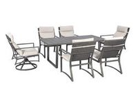 Sit back and relax with the Rainer 7-piece dining set, the perfect way to enjoy a meal with friends and family outdoors. Made with durable steel with a powder coated finish. Includes two swivel chairs as well as four stationary cushioned sling chairs and one 72" table for comfortably seating six people. This collection was made to create your perfect outdoor oasis.