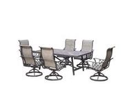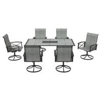 The Vanderbuilt seven-piece dining set includes a dining table, four swivel rocker dining chairs, and two stationary dining chairs. These pieces are constructed with sturdy steel frames. The table has a faux wood slatted tabletop. The chairs have outdoor UV-protected olefin fabric and woven backs for comfort and style. Easy to assemble, this set is intended for outdoor use.