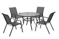 Bring elegance to your outdoor entertaining space with the Backyard Creations® Harrison patio dining set. Manufactured with durable steel tubes and stylish smoke tinted glass, the classic design of this chair is complemented by gray sling fabric.