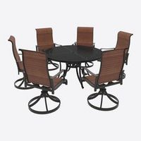 With this large dining table and chair set, you're always in the flow of conversation. The table sports an elegant and practical lattice top that allows rainwater to drain quickly. You'll love sipping a beverage on one of the supportive sling seats.