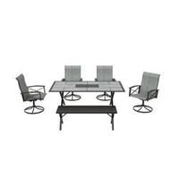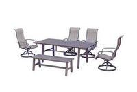 The Harden Hills six-piece dining collection has four swivel rockers, a bench, and a rectangular slat top dining table. This durable set is sure to be enjoyed for years to come. It adds both style and functionality to your outdoor space.