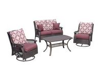 This Allenwood deep seating patio set features handwoven, wicker-wrapped, all-weather steel frames for a warm, welcoming look. This collection includes two swivel gliders that come with fade-resistant, reversible cushions, a matching loveseat with cushions, and a 27-by-43-inch slat top coffee table.