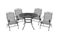 This dining set combines traditional powder-coated wrought iron frames with diamond mesh spring action motion chairs. The dining table has a diamond mesh top with an umbrella hole. A fully welded construction provides durability, while the powder-coated finish allows for years of use.
