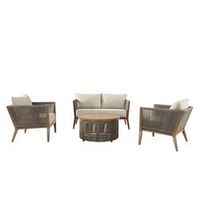 The Wilmington seating set features two chairs, a cozy loveseat, and a charming round coffee table, all beautifully crafted with all-weather wicker roping and easy-care fabric cushions. The deep seating offers a wonderful spot for relaxation, making it perfect for entertaining around the table. Let the Wilmington seating set become the centerpiece of your patio, providing comfortable seating for your friends and family. Its stylish design is a great fit for your patio, lawn, garden, or poolside.