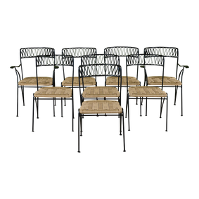 Wrought Iron Garden Patio Poolside Loveseat Bench att. to Salterini ... loveseat features a wrought iron frame with a continuous seat and backrest made of metal mesh. This example ... By Woodard Furniture Co. ... craftsmanship with bold floral flair. Each chair features an elegant wrought iron frame with intricate scroll ... By Woodard Furniture Co. ... Vintage Wrought Iron Garden Patio Poolside Bench Att.